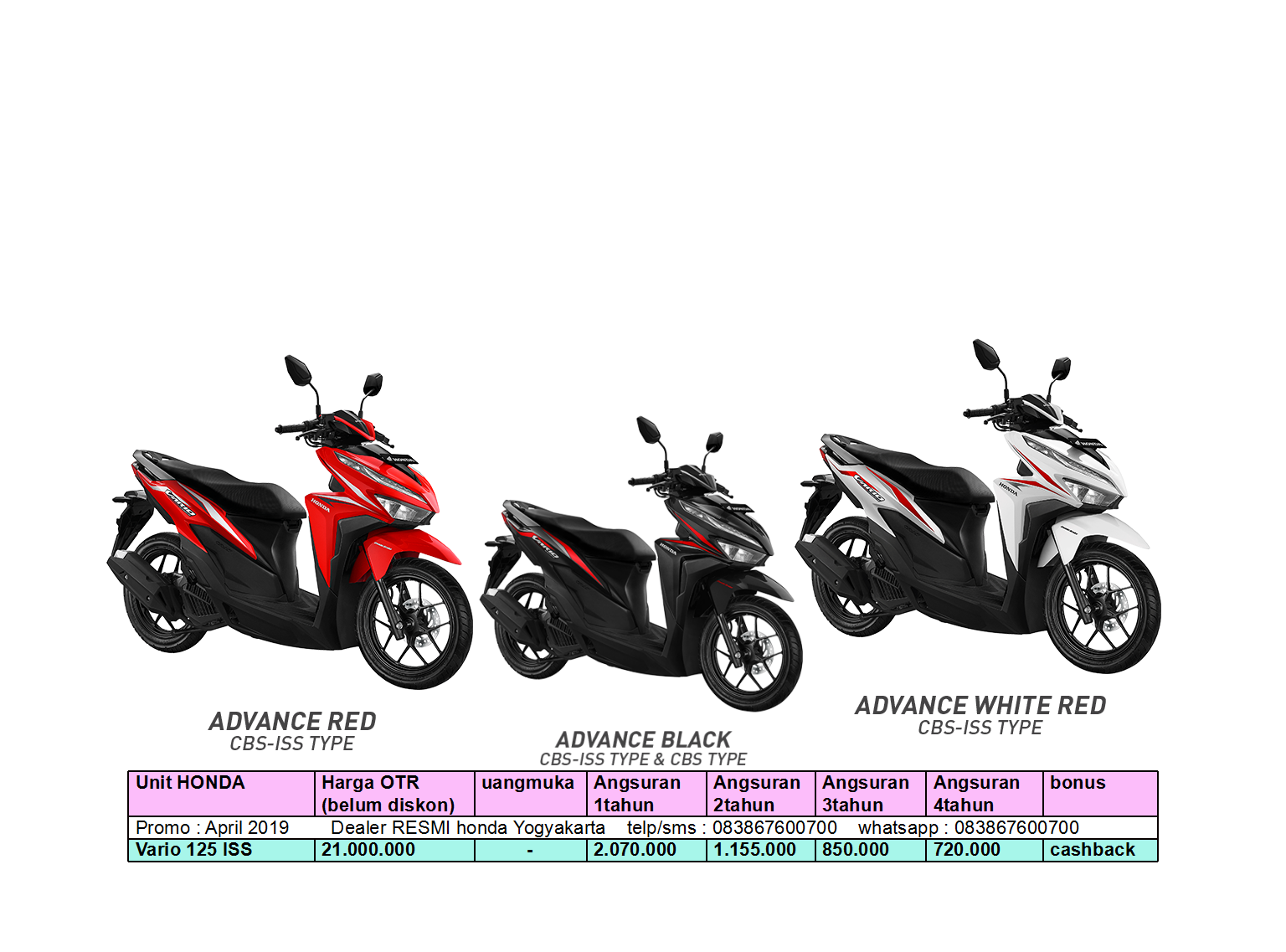 Menjadi retailer sepeda motor honda pilihan dengan memberikan solusi yang melebihi harapan konsumen dan juga menyediakan informasi seputar harga spesifikasi motor honda lengkap dan terupdate. Dapatkan promo menarik berupa diskon dp dan potongan cicilan untuk motor honda impianmu untuk wilayah kota bogor dan sekitarnya. Diskon paling besar, angsuran super ringan, berkas dibantu & proses cepat.